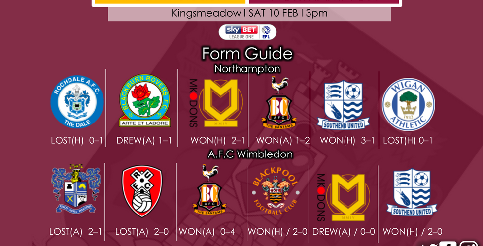 STATSEthan GrandeFeb 10, 20181 min readA Form Guide telling you how each club have played in the last 6 games.Head 2 Head. The last time the two clubs met. Biggest Northampton victory. Stats #Stats #AFCWimbledonVSNorthampton